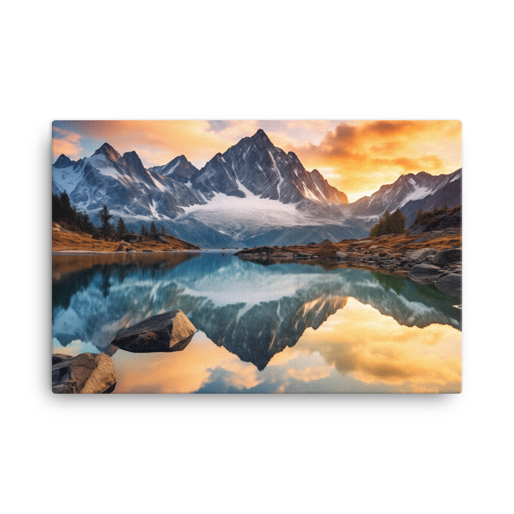 Alpine Majesty” is a stunning collection of canvas prints, each depicting the awe-inspiring beauty of mountain landscapes at sunset. These artworks capture the tranquil yet powerful presence of alpine peaks, with the sun’s dying light casting a golden glow over the mirrored surfaces of crystal-clear lakes. The vibrant colors of the sky, reflecting on the water’s surface, create a symphony of warm tones that enhance the majestic tranquility of the mountain scenery.