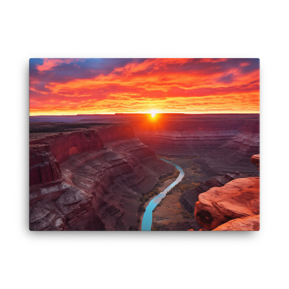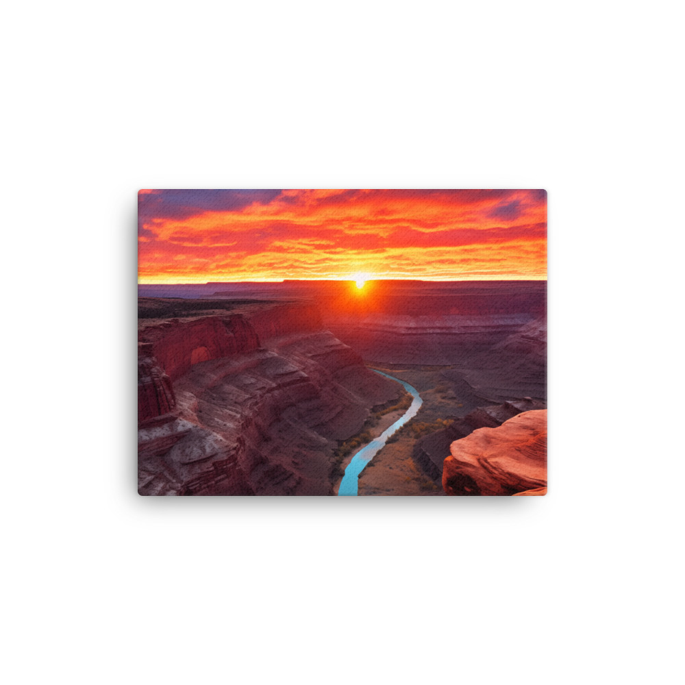 Embark on a visual journey with “Canyon Reverie,” a stunning collection of canvas prints that capture the fiery spirit of sunset over the grand canyons. Each piece in this series is a tribute to the breathtaking interplay of light and shadow, as the day’s last rays kiss the rugged landscapes of the canyons. The vivid reds and oranges of the sky contrast magnificently with the deep blues and purples of the winding rivers below, creating a visual symphony that celebrates the dramatic beauty of nature.