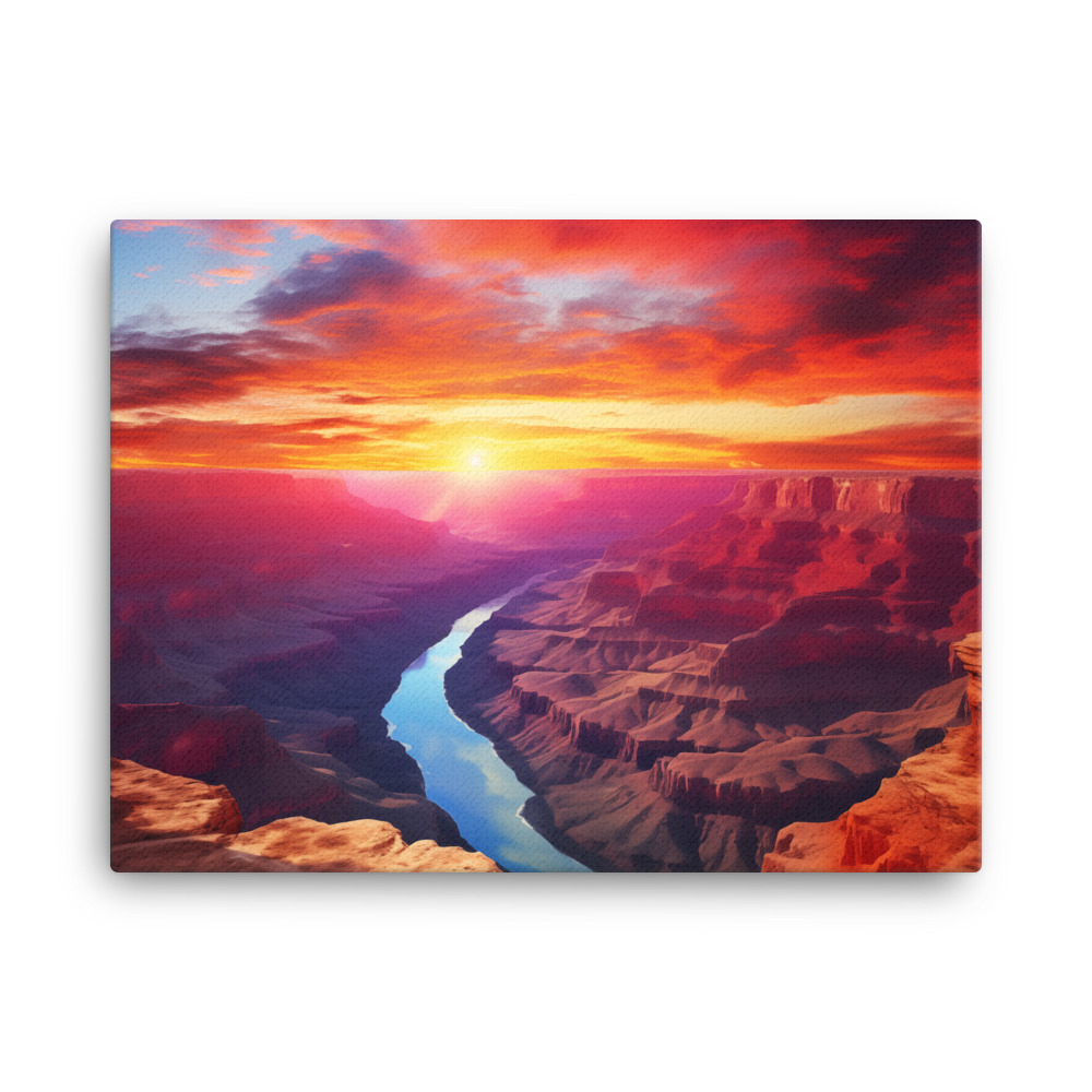 Embark on a visual journey with “Canyon Reverie,” a stunning collection of canvas prints that capture the fiery spirit of sunset over the grand canyons. Each piece in this series is a tribute to the breathtaking interplay of light and shadow, as the day’s last rays kiss the rugged landscapes of the canyons. The vivid reds and oranges of the sky contrast magnificently with the deep blues and purples of the winding rivers below, creating a visual symphony that celebrates the dramatic beauty of nature.