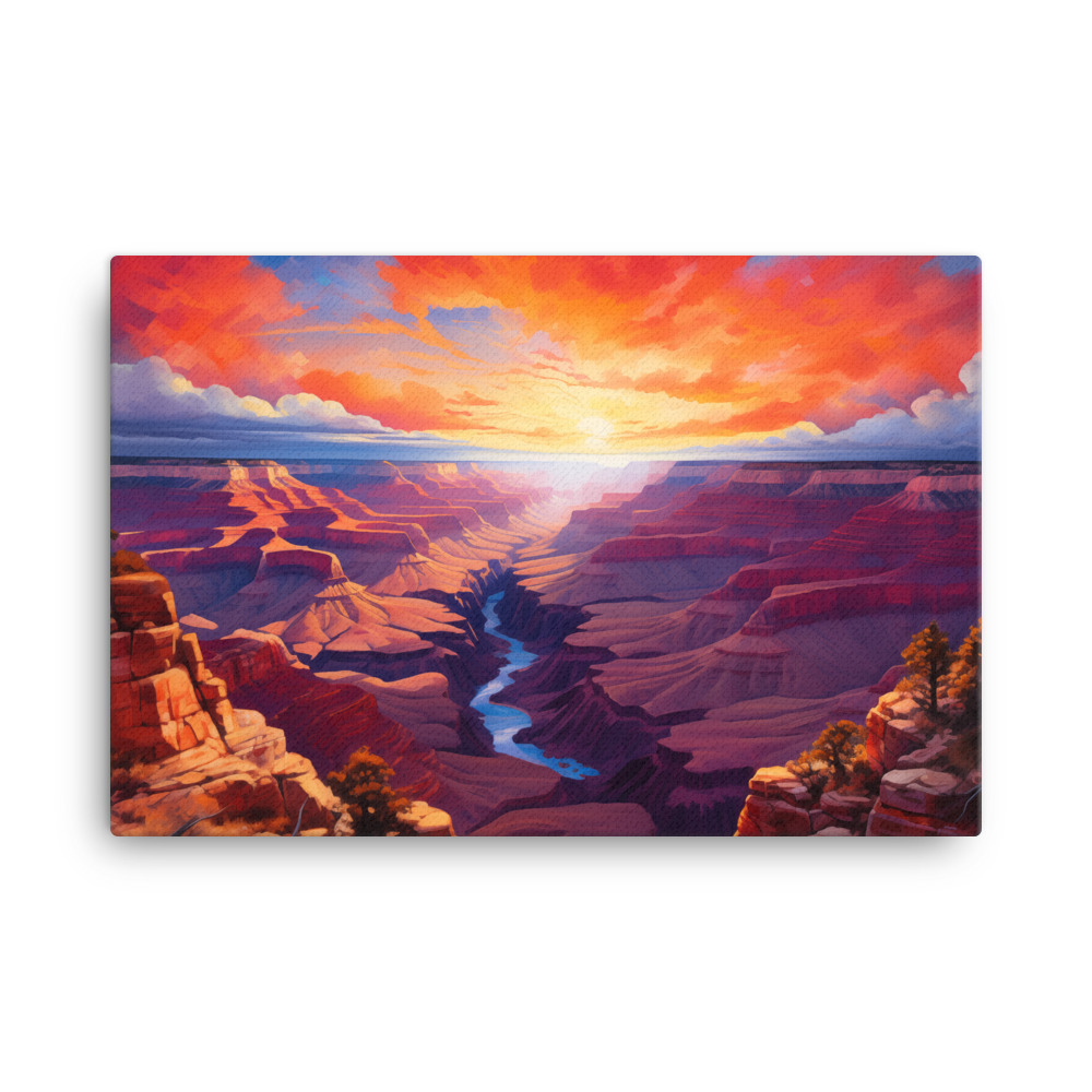 Embark on a visual journey with “Canyon Reverie,” a stunning collection of canvas prints that capture the fiery spirit of sunset over the grand canyons. Each piece in this series is a tribute to the breathtaking interplay of light and shadow, as the day’s last rays kiss the rugged landscapes of the canyons. The vivid reds and oranges of the sky contrast magnificently with the deep blues and purples of the winding rivers below, creating a visual symphony that celebrates the dramatic beauty of nature.
