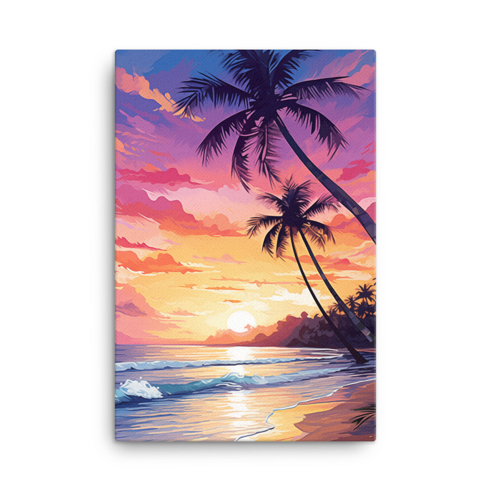 Discover the serene allure of “Tropical Twilight,” a collection of canvas prints that captures the enchanting moments of sunset on tropical beaches. Each artwork is a vibrant portrayal of paradise, where the silhouettes of palm trees sway against a backdrop of spectacular sunsets. The radiant colors of the twilight sky, from deep purples to fiery oranges, reflect upon the gentle waters, creating a peaceful harmony between sky and sea.