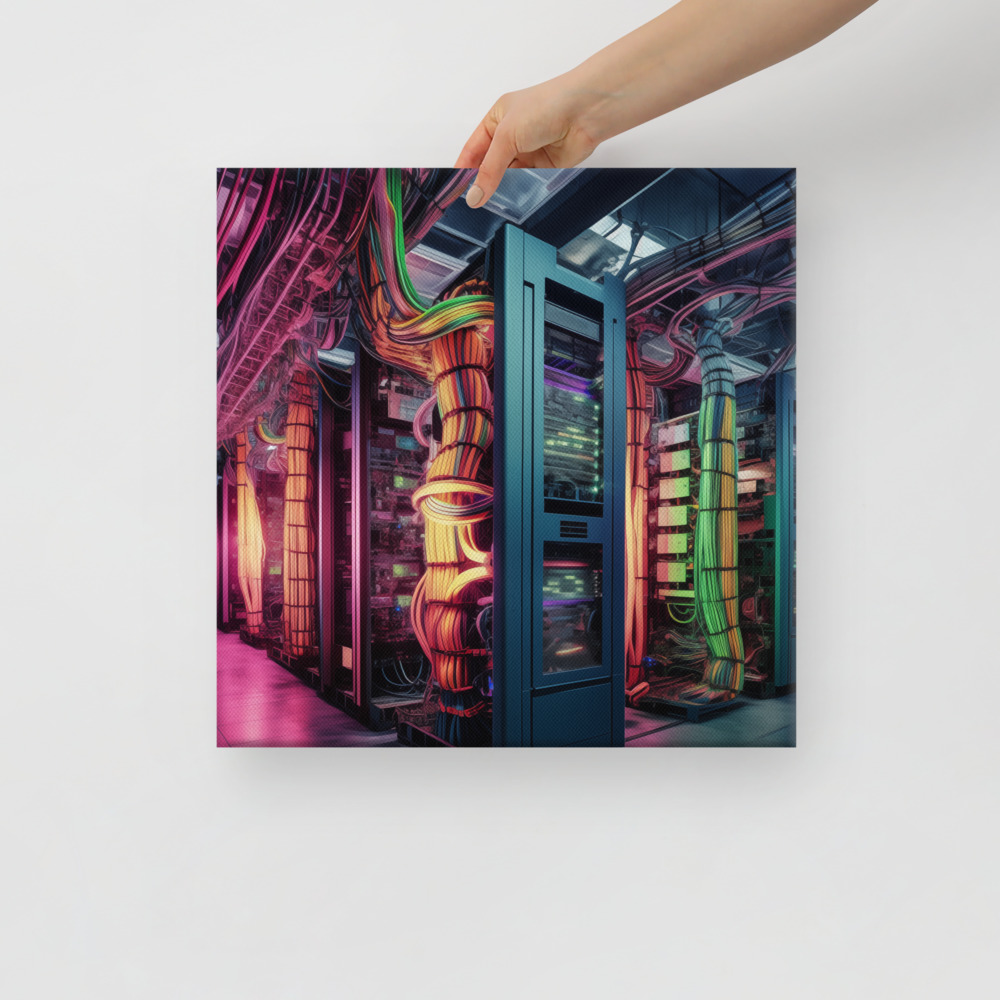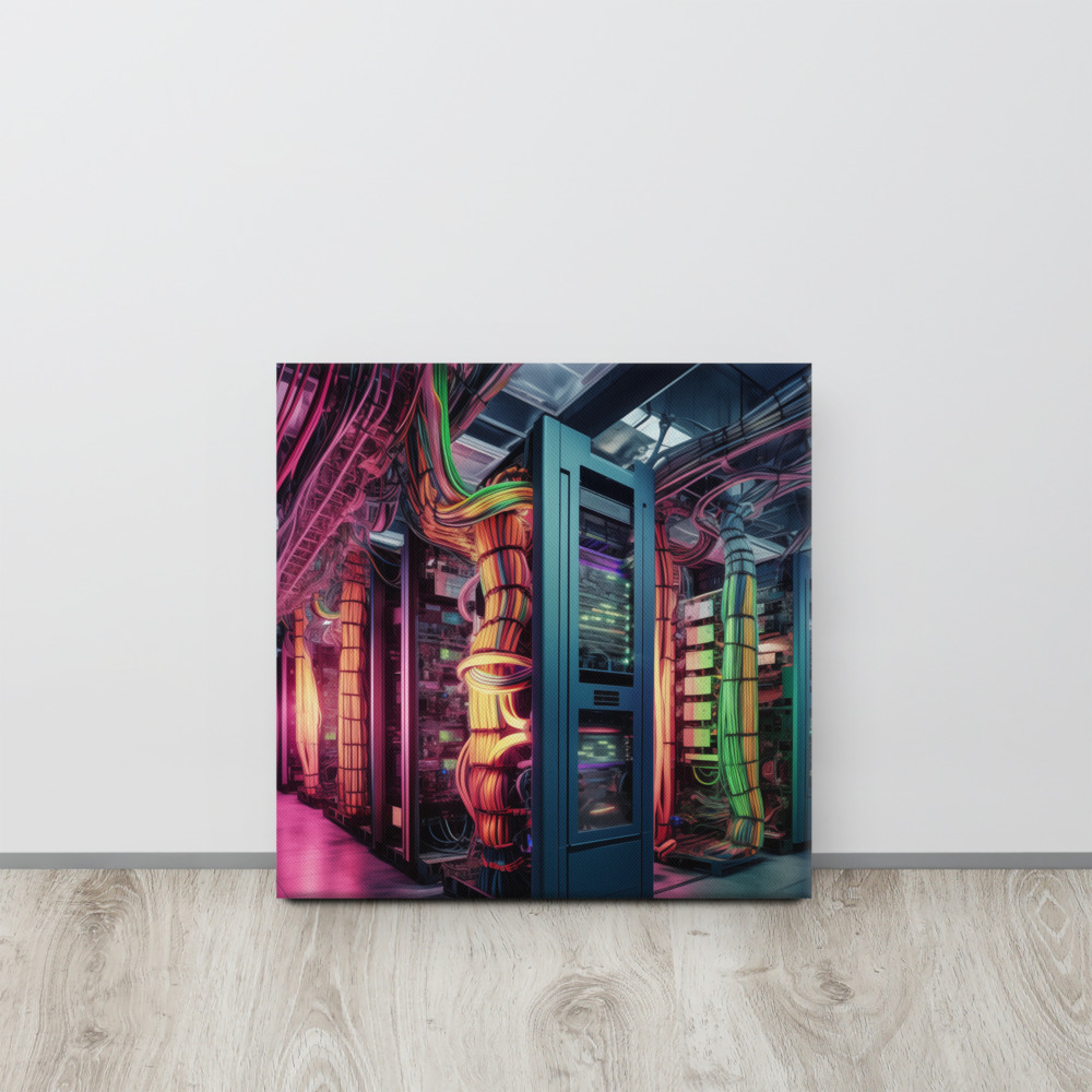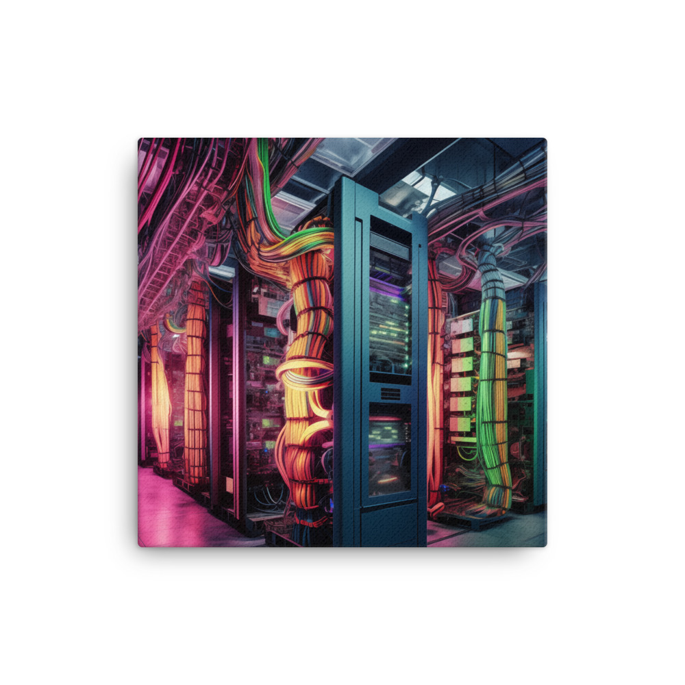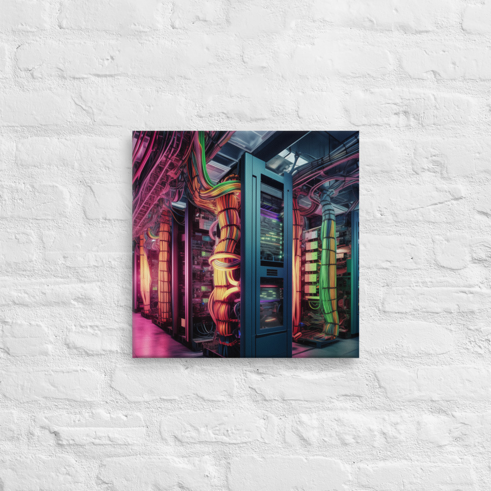 The lush palette of greens and the radiant glow from the servers create a captivating scene that is both serene and thought-provoking. As a conversation piece, this canvas print is perfect for those who appreciate the beauty of nature, the intrigue of futuristic concepts, and the silent narrative of a world beyond our own. It is a must-have for collectors, tech enthusiasts, and nature lovers seeking to add a touch of speculative fiction to their decor.